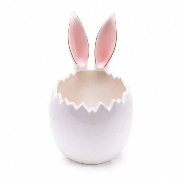 Bomboniere maravilhosa de porcelana em forma de casca de ovo com orelhas de coelho e detalhes em dourado metalizado. Perfeita para compor sua mesa posta, servir sobremesas ou decorar o bar ou bufê na Páscoa.