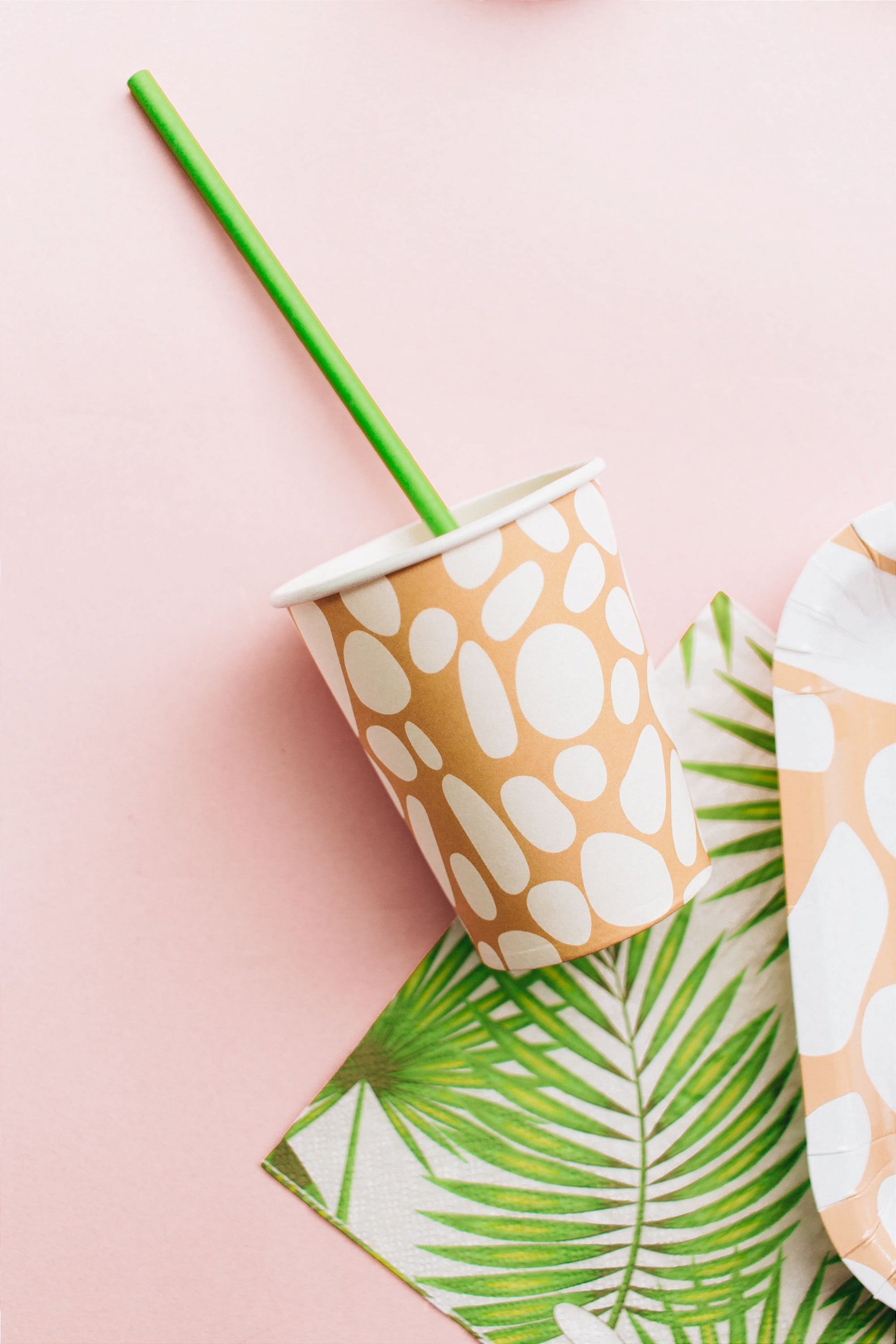 Conjunto de copos de papel cor kraft com estampa de girafa. Ideal para festas com tema selva, safari, animais e outros.