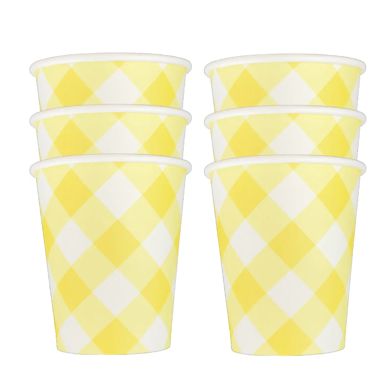 Os copos de papel com estampa xadrez amarelo trazem aquele ar alegre e ensolarado para qualquer mesa de festa. Perfeitos para aniversários, piqueniques ou chás, eles deixam a decoração mais divertida e cheia de vida.