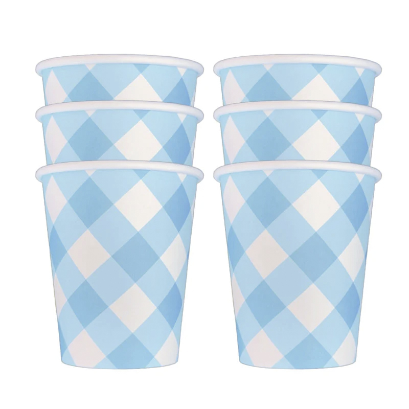 Os copos de papel com estampa xadrez azul são daqueles que trazem um charme instantâneo para qualquer mesa de festa. Leves e alegres, combinam bem com aniversários, chás, piqueniques e até festas temáticas campestres.