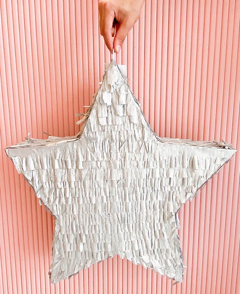 No momento da brincadeira, é só puxar os fios da pinhata estrela prateada de puxar , um deles "abre" a pinhata, e os doces se espalharão pela festa.