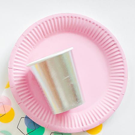 Conjunto de 10 pratos lisos rosa de papel biodegradável.