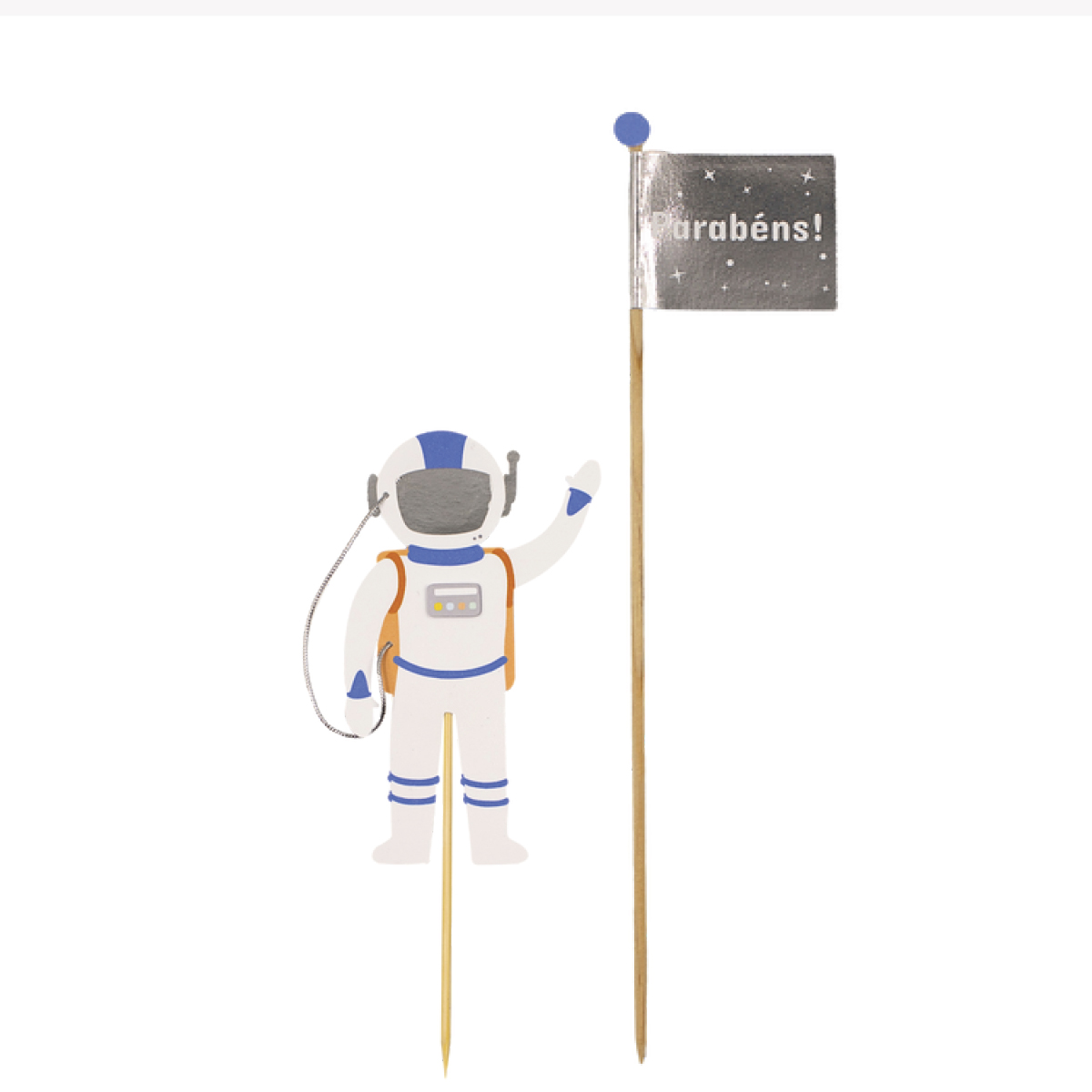• Conteúdo: 2 topos (astronauta + bandeirinha “Parabéns!”)