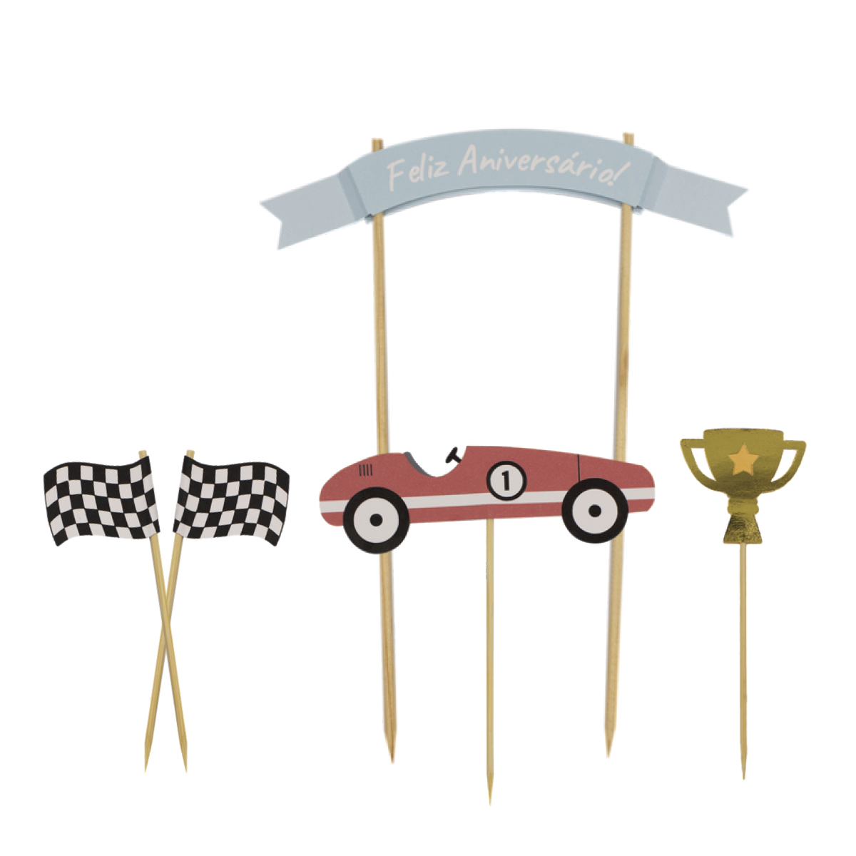 • Conteúdo: 6 hastes (arco “Feliz Aniversário”, carro, bandeiras e troféu)