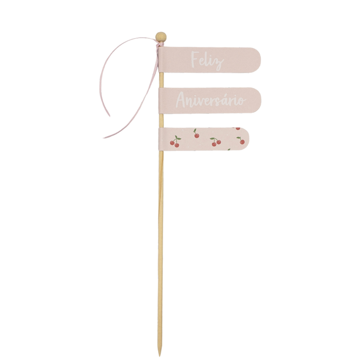 O Topo de Bolo Feliz Aniversário Rosa Cerejas é aquele detalhe delicado que deixa o bolo imediatamente mais fofo e com cara de festa bem pensada. As bandeirinhas rosadas, com tipografia suave e a faixa estampada de cerejinhas, criam um visual doce e leve, perfeito para temas românticos, piqueniques, chá de bebê ou simplesmente para quem ama uma estética charmosa.